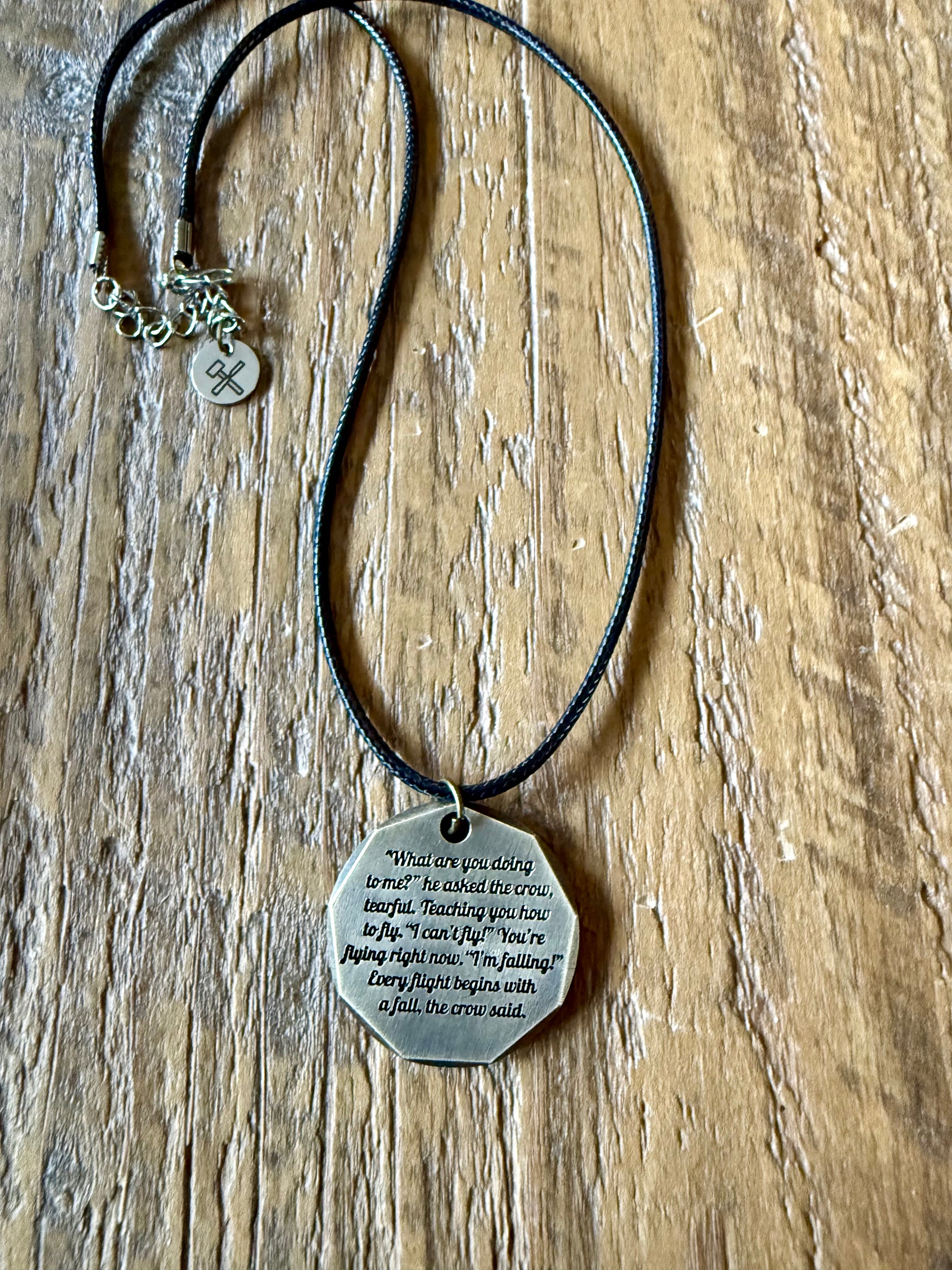 This crow is on a mission. With a scroll clutched in its talons and a potion held in its beak, its nighttime journey is clearly of the utmost importance. This brass hexagon pendant features this daring crow on one side, and a quote about flying and falling on the back.