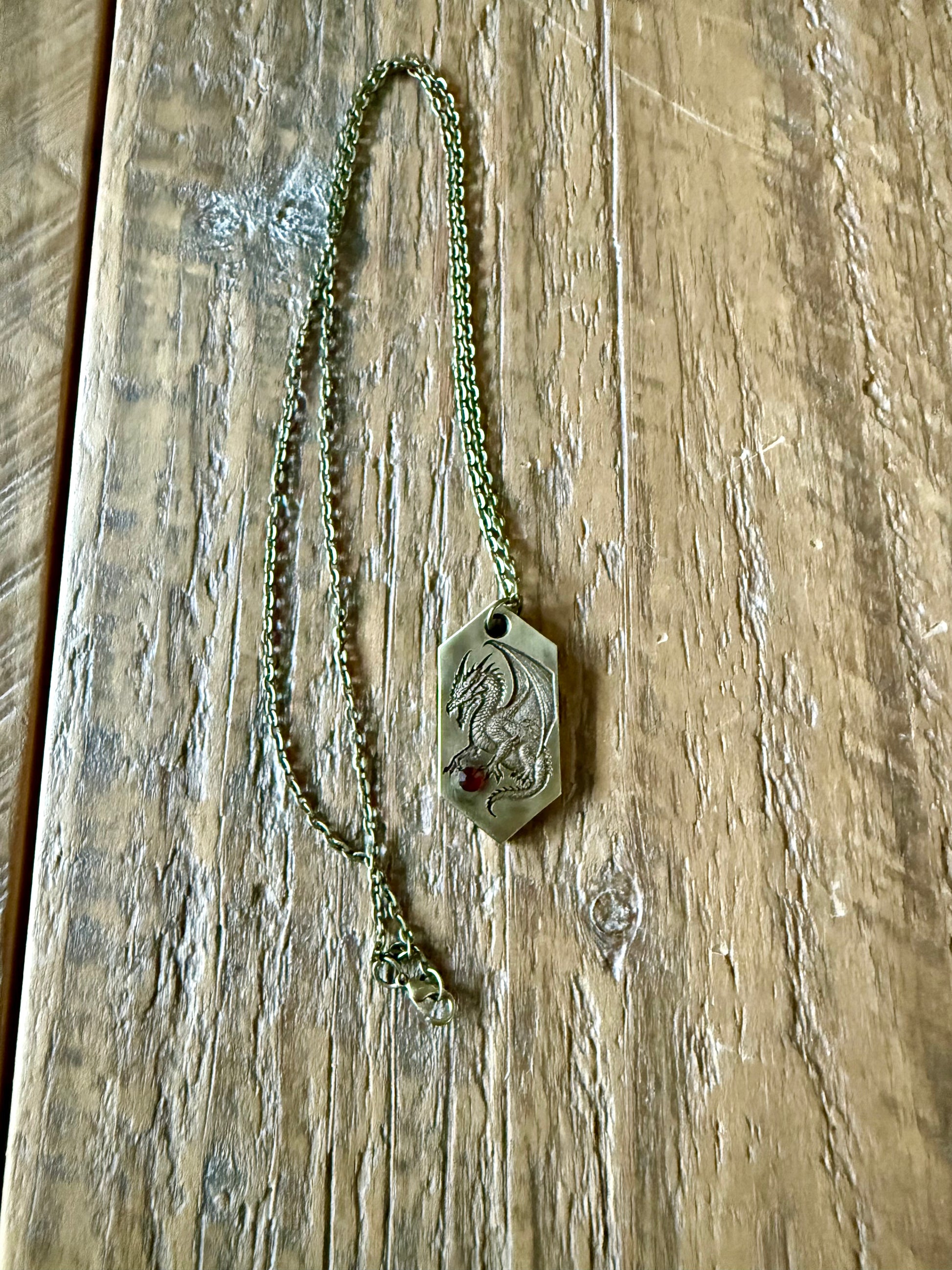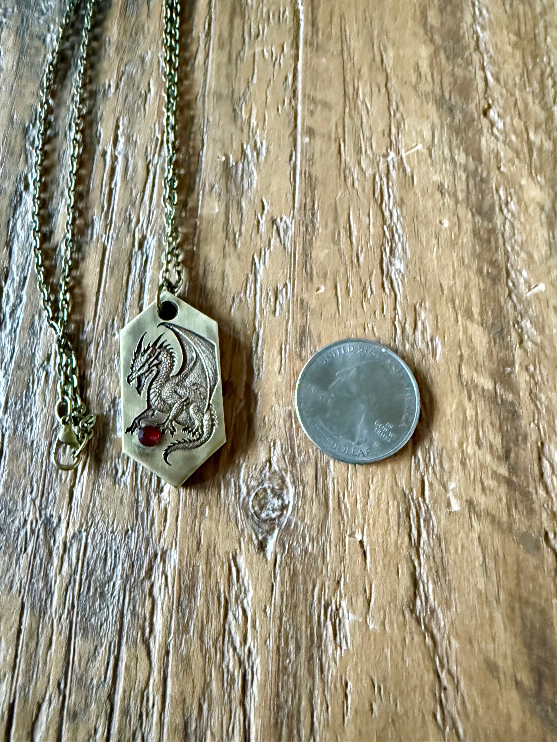 This nonagonal pendant features an embossed dragon guarding a giant (faux) ruby. Why do dragons love the shiny so much? Their hunger for it isn't easily satisfied.