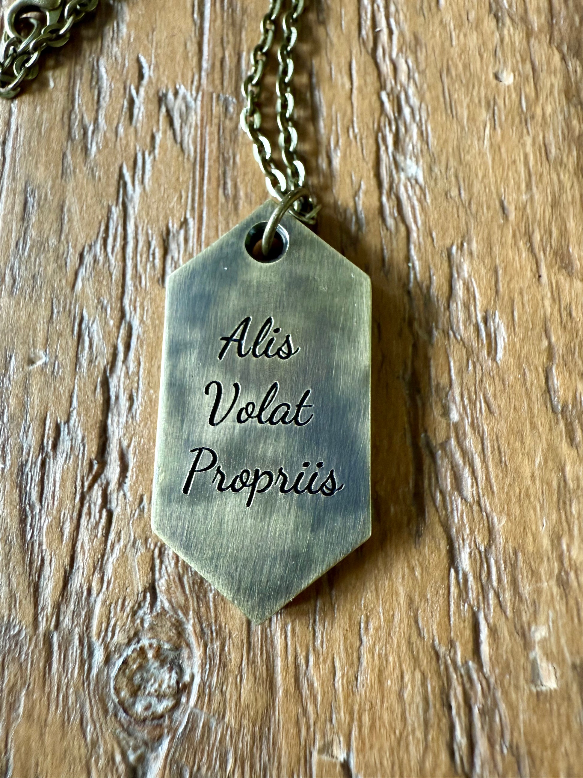 This brass pendant is approximately 1.5" L x 3/4" W and features a deeply embossed hummingbird. The back includes the Oregon state motto: She flies with her own wings. Aged to provide a distinct patina, each piece of brass showcases it's unique properties ensuring no two are ever exactly alike.
