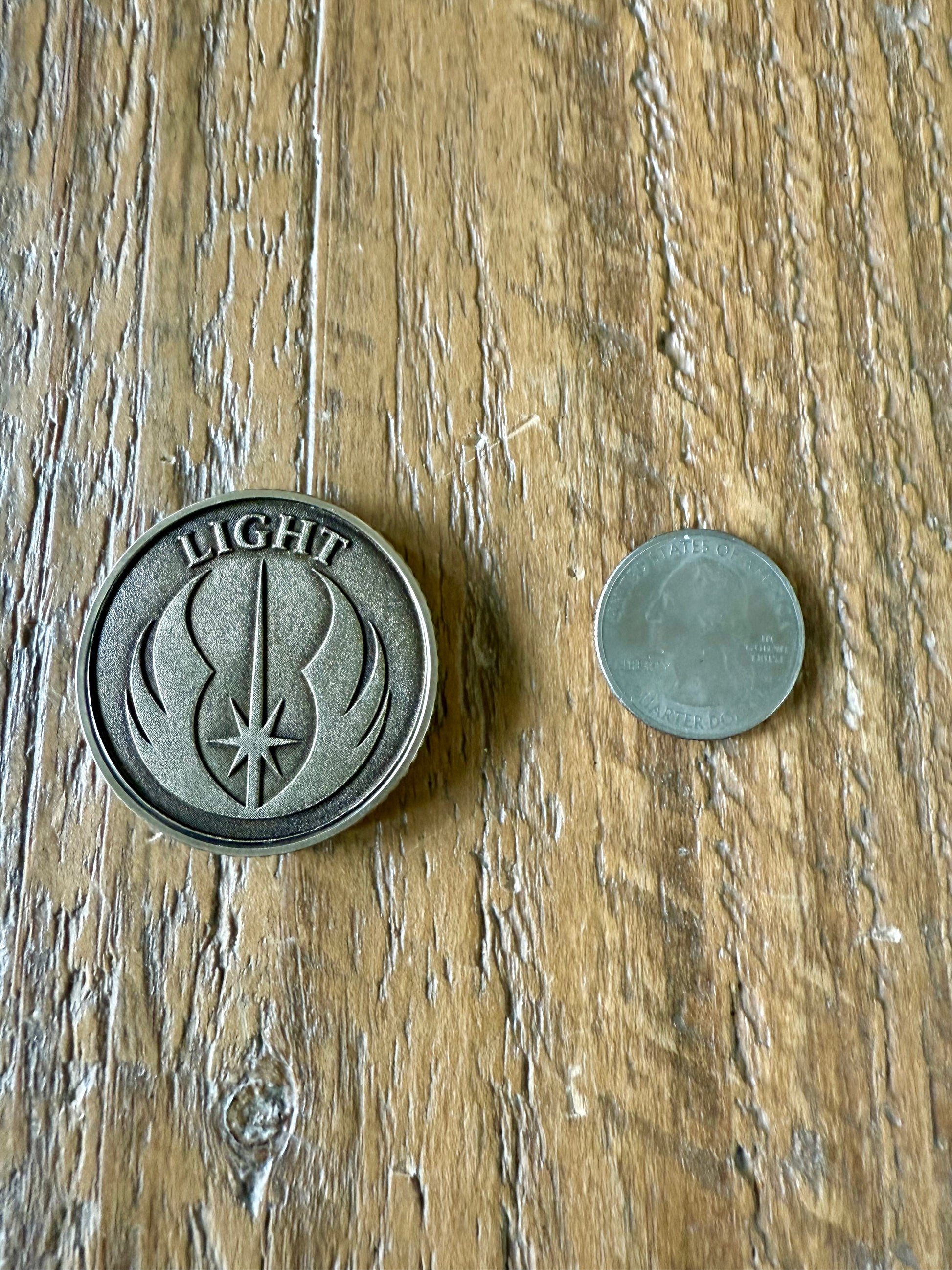 A variation of heads or tails, but for fans from a Galaxy far far away. This 40mm W x 4mm D embossed coin features emblems of the Sith and Jedi on opposite sides, letting The Force dictate the right outcome for you.