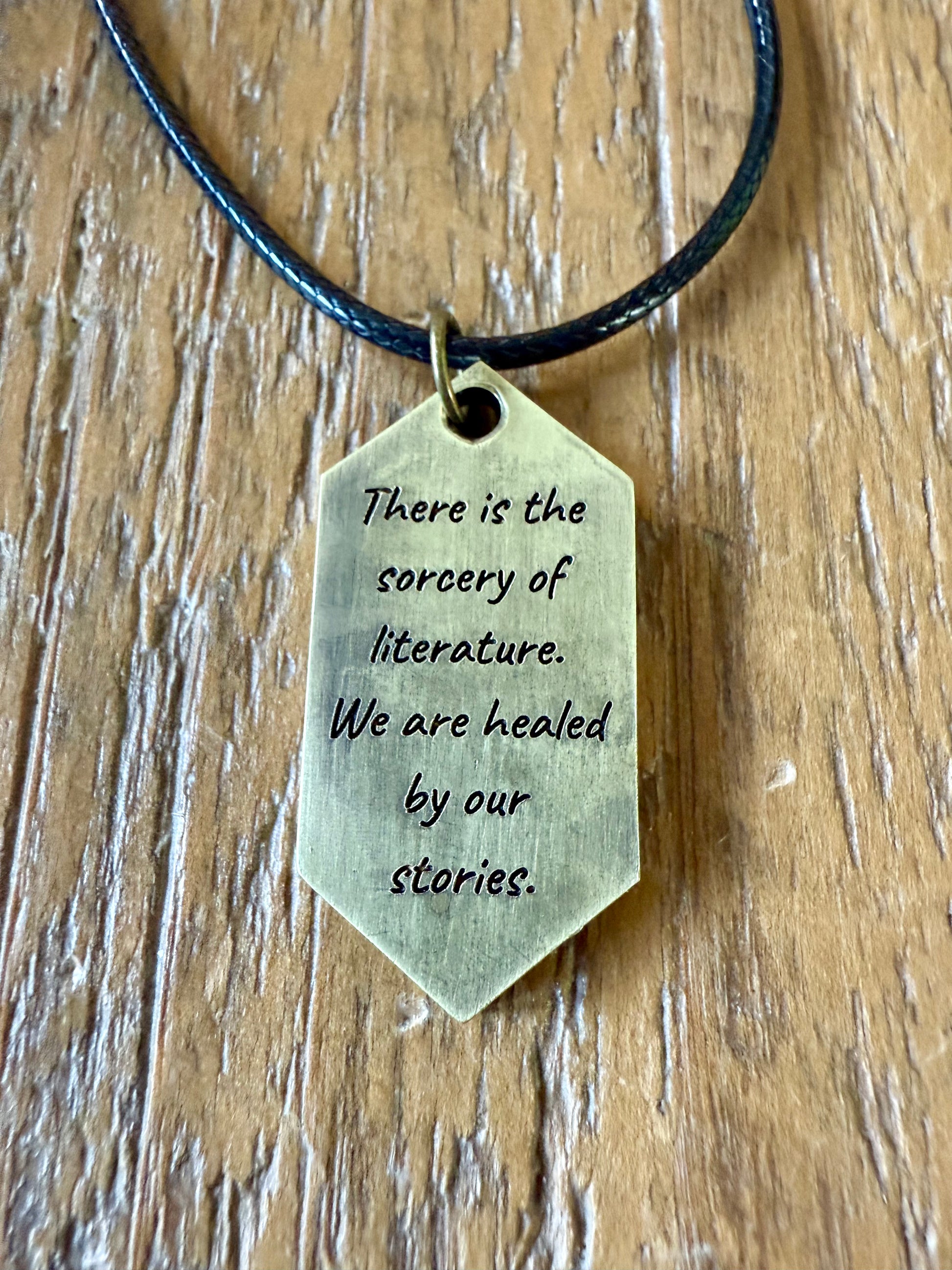 Weave a spell, summon a beasty, whatever your lil sorcerer's heart desires with this hexagonal pendant featuring a sorceress wielding a supernatural blue (faux gem) flame.